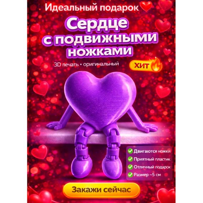 Милое фиолетовое сердечко с подвижными ножками — это необычная 3D фигурка с ярким и стильным дизайном. Благодаря гибкой конструкции оно легко двигается и создаёт приятный антистресс эффект.