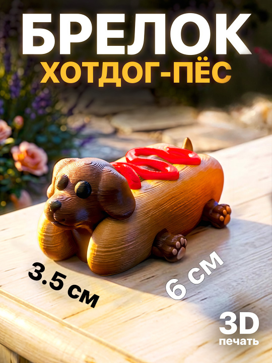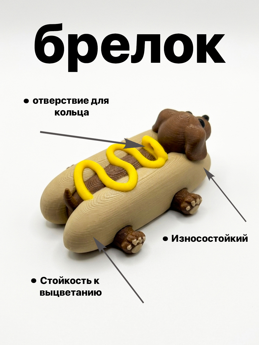Оригинальный брелок в виде забавной собачки-хотдога — яркий и необычный аксессуар, который сразу привлекает внимание. Модель выполнена методом 3D-печати, благодаря чему имеет интересную текстуру и приятную детализацию.