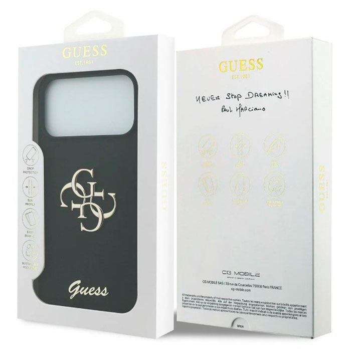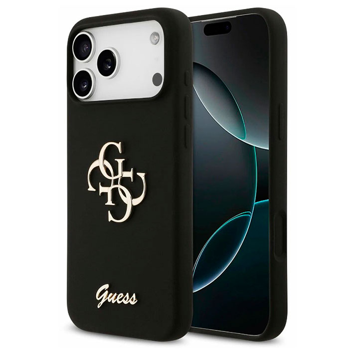 Дизайн: Минималистичный черный фон, акцент металлическим логотипом Guess на задней панели