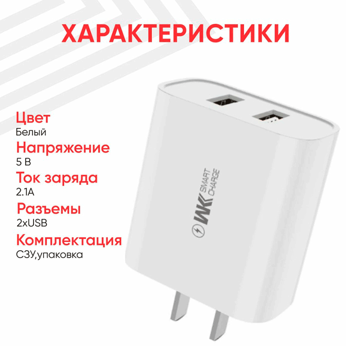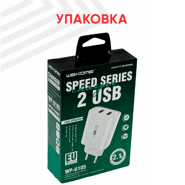 WP-U105 — универсальное зарядное устройство с двумя портами USB-A и суммарной мощностью 2.1А. Надёжная и удобная зарядка для смартфонов, наушников и других USB-гаджетов.