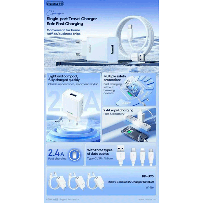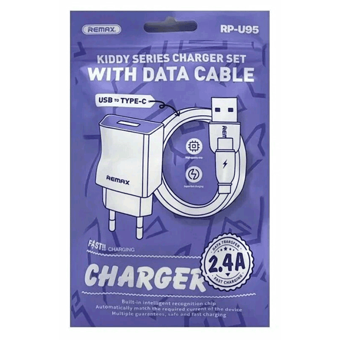 Remax RP-U95 — компактное и надёжное сетевое зарядное устройство с кабелем USB Type-C, обеспечивающее ток до 2.4A для быстрой и стабильной зарядки смартфонов, планшетов и других совместимых устройств.