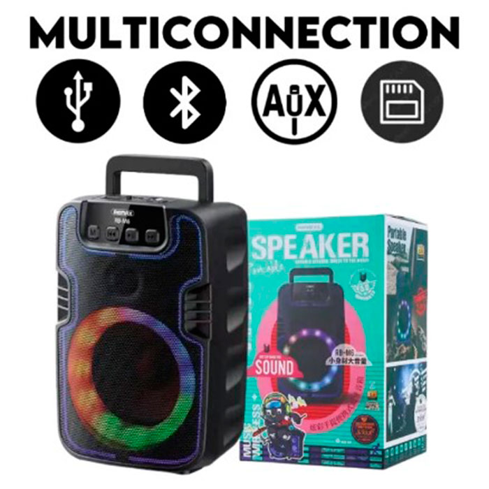 Портативная колонка REMAX RB-M6 — современная Bluetooth акустика с LED-подсветкой. Поддерживает воспроизведение музыки через USB, AUX и карту памяти microSD, а также оснащена FM-радио. Оснащена аккумулятором 1200 mAh для продолжительной автономной работы.