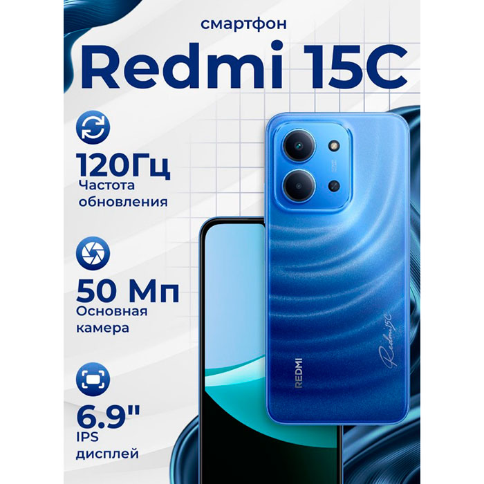 Смартфон Xiaomi Redmi 15C 4/128GB, 120 Гц, Android 15, синий — это сочетание высокой производительности, стильного дизайна и передовых технологий. Модель оснащена 6.9-дюймовым IPS-дисплеем с разрешением Full HD+ и частотой обновления 120 Гц, что обеспечивает плавную картинку при играх, просмотре видео и прокрутке страниц.