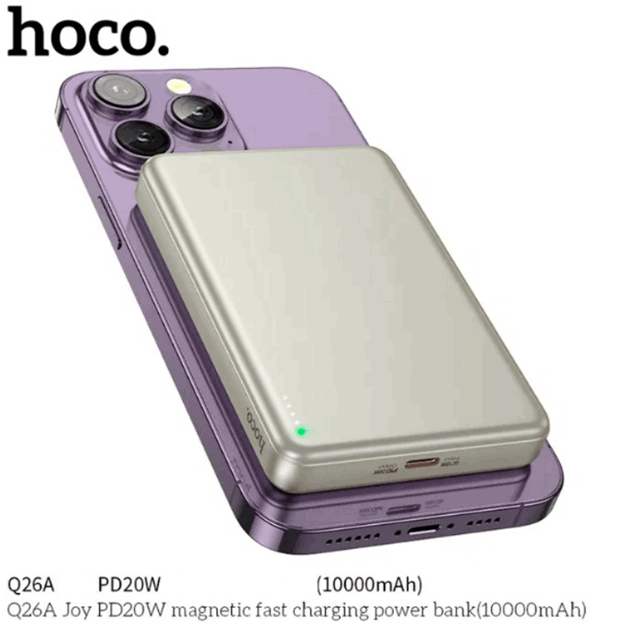 Hoco Q26A — это современное беспроводное зарядное устройство и внешний аккумулятор 2 в 1, идеально подходящее для зарядки смартфонов, наушников и других гаджетов.
