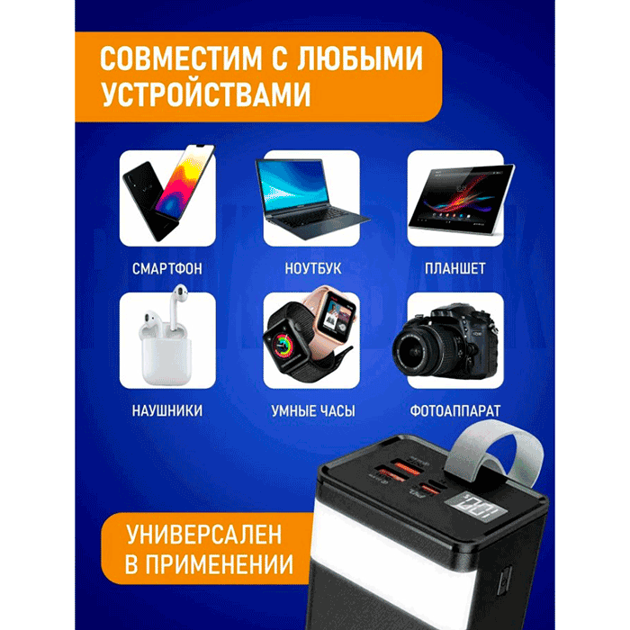 Аккумулятор оснащён несколькими выходами USB и Type-C, что позволяет заряжать до трёх устройств одновременно.