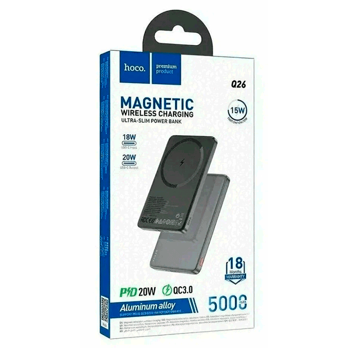 Hoco Q26 — это тонкий и лёгкий внешний аккумулятор с поддержкой MagSafe, идеально подходящий для зарядки iPhone и других совместимых устройств.
