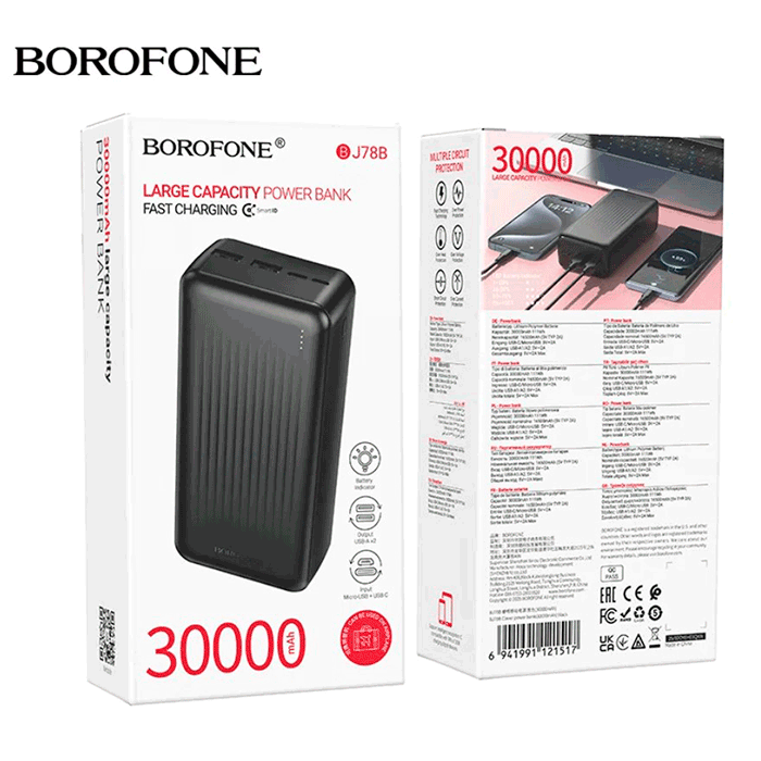 Borofone BJ78B — надёжный Power Bank с большой ёмкостью 30000 мАч, который обеспечивает многократную зарядку устройств без розетки.