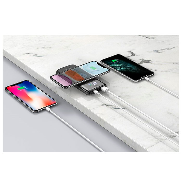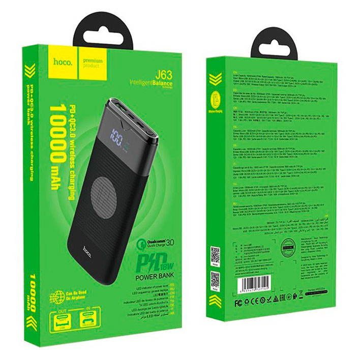 Портативный аккумулятор Hoco J63 (10000 мА·ч) — отличный выбор для пользователей, которым нужна надёжная внешняя батарея с современными функциями. Он позволяет заряжать смартфоны, планшеты и другие устройства благодаря поддержке стандартов PD и QC 3.0, имеет два входа (Micro-USB и Type-C) и сразу несколько выходных режимов, включая беспроводную зарядку до 10 Вт. Устройство изготовлено из качественных материалов с огнестойкой защитой, весит всего ~232 г и имеет привлекательные габариты 150×68×17 мм — удобно носить в сумке или рюкзаке.