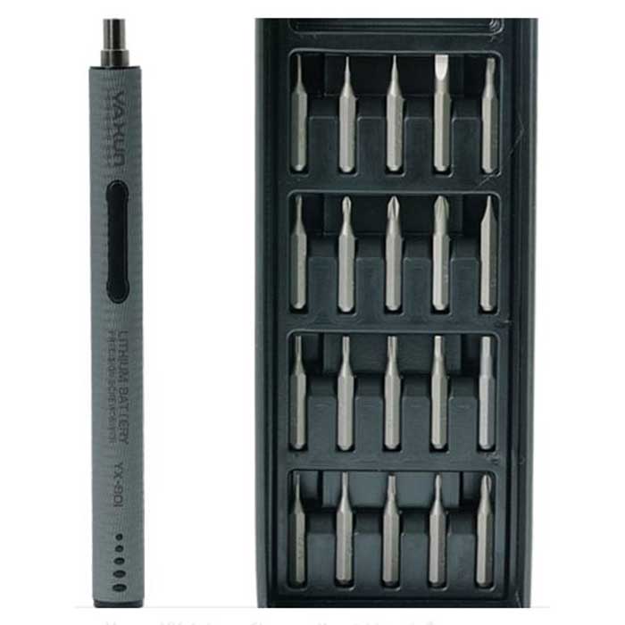Компактная легкая электроотвертка, идеально подходит для ремонта мобильной электроники. В комплекте 20 разных насадок, что позволяет использовать отвертку для ремонта любых электронных устройств, в том числе iPhone, iPad, Xiaomi, Huawei, Lenovo, Samsung и других. На корпусе отвертки расположены кнопки включения и реверса и индикатор заряда.