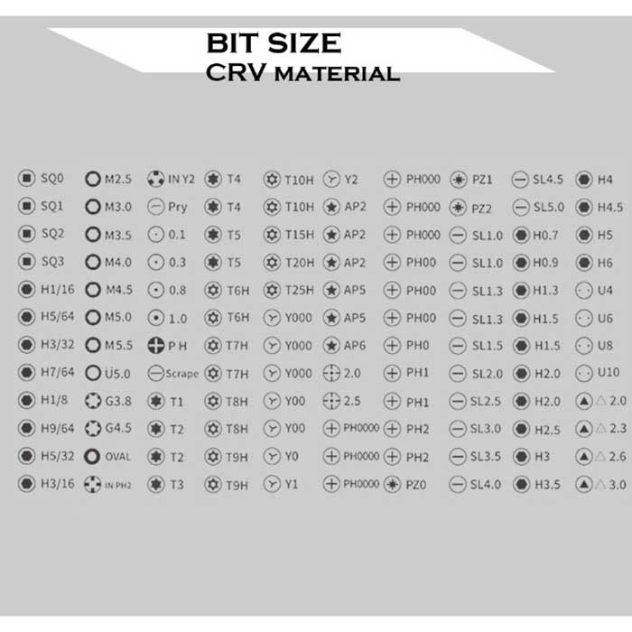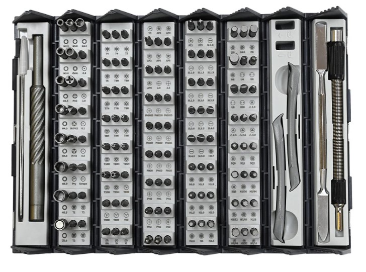 Набор включает в себя отвертки с разными типами и размерами головок, такими как Phillips, Flathead, Torx, Hex, Pentalobe, Tri-point и другие. Также в комплекте есть различные расширители, адаптеры и удлинители для удобства работы со винтами в труднодоступных местах.