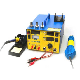Паяльная станция - аппарат для комплексного решения работы по пайке. Даёт возможность полного контроля пайки (быстрое переключение с высокой до низкой температуры и наоборот). Стабильное поддержание заданных параметров нивелирует риск перегрева соседних элементов или основы. Индикация температуры обычно выведена на цифровой дисплей и регулируется либо кнопками с шагом в один градус, либо плавным регулятором. Также бывают и аналоговые модели.