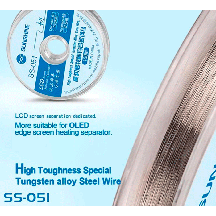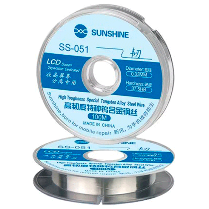 Струна Sunshine SS-051 молибденовая для разделения дисплеев и сенсоров с толщиной 0.03 мм и длиной 100 м — это высококачественный инструмент, который поможет быстро и безопасно разделить стекло и сенсор при ремонте экранов мобильных устройств. Благодаря молибденовой основе, струна обеспечивает высокую прочность и долговечность, что делает её отличным выбором для профессионалов в сфере ремонта электроники.
