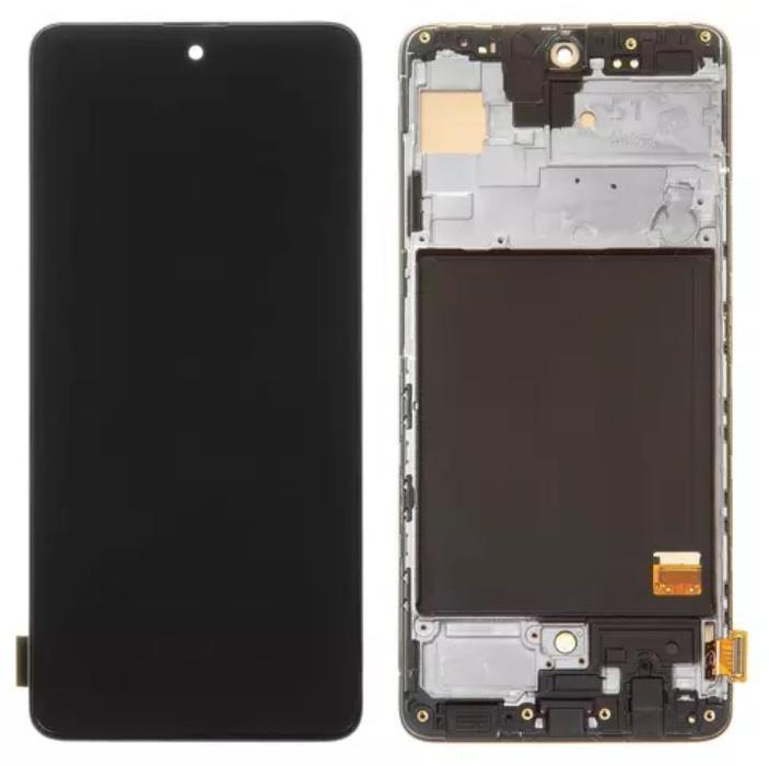 Дисплей для Samsung Galaxy A51 (2019) (модель A515F) с рамкой, черный, OLED — это комплект, состоящий из экрана с технологией OLED, сенсорной панели и рамки, предназначенный для замены поврежденного или неисправного дисплея на этом смартфоне. Вот подробные характеристики этого дисплея: